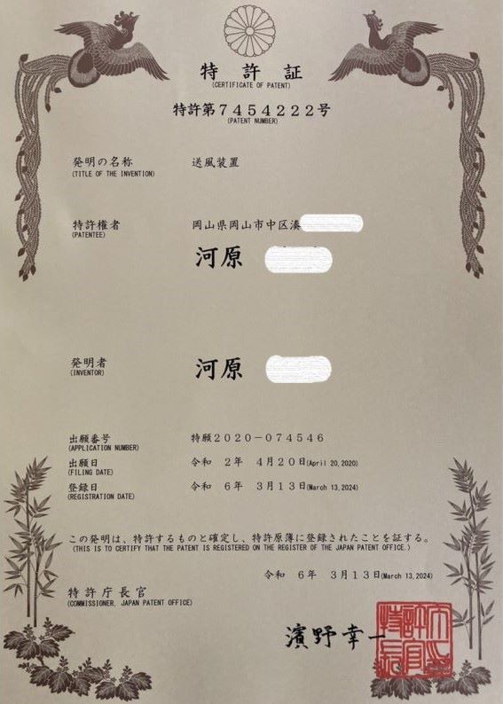 2024年3月13日に特許庁から特許証が送られてきました。数年の歳月がかかりましたが特許としてニーズジャパン発明の『送風装置』が認められました。